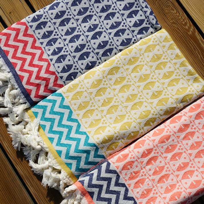 Our 100% cotton peshtemals are highly absorbent, light and dry very quickly. Traditionally used in Turkish baths, peshtemals are perfect ot be used as beach towels, as well as use at home or by the pool.