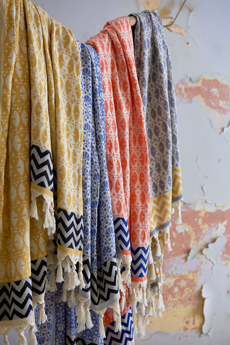 The floral motif of the 'Jaipur' peshtemal is a modern interpretation of the carnation flower typical of Iznik pottery in Turkey, whereas the lattice was inspired by the beautiful stonework of the Rose Gate of Jaipur’s City Palace in India. Our 100% cotton peshtemals are highly absorbent, light and dry very quickly. Traditionally used in Turkish baths, they are ideal for travelling, as well as use at home or by the pool.