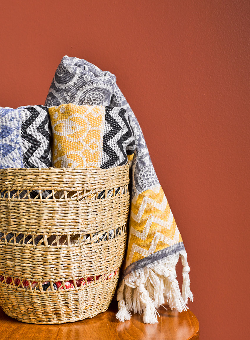 Featuring a motif that merges a fish with a lotus flower, the Mahi towel is a tribute to the life-giving properties of water. Lotus flowers are sacred in Hinduism, where they are seen as a symbol of beauty and fertility, while also representing purity and spiritual enlightenment in Buddhism. The fish, an indispensable part of Istanbul's identity, marks the importance of the Bosphorus in the spirit of the city. Our 100% cotton peshtemals are highly absorbent, light and dry very quickly. They are ideal for travelling, as well as use at home or by the pool.